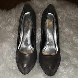 These are a metallic grey shoes. It has a 4.5 inch chunky heel. Can be worn with Jean's or a skirt. Only wore once. Excellent condition.