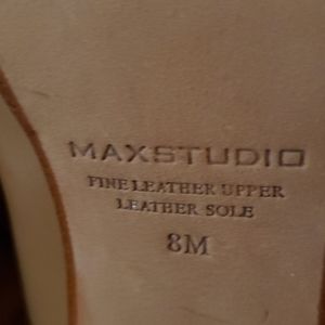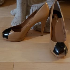 Tan and black leather open toe pumps. New, never worn. 4.5 inch heel.