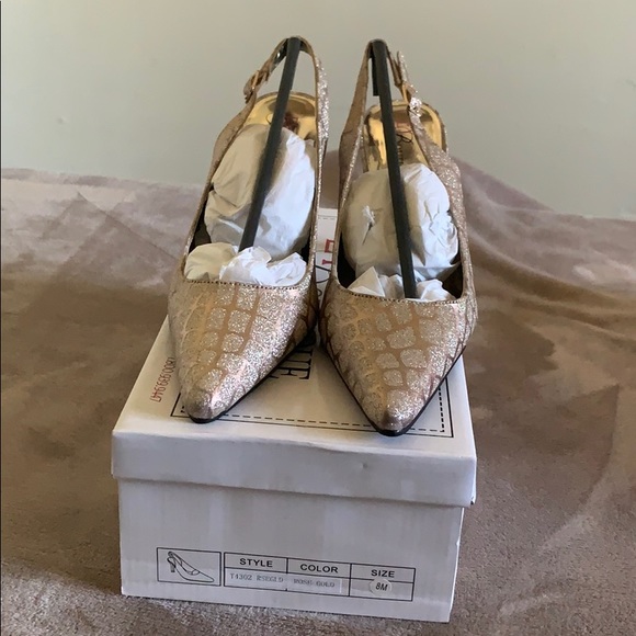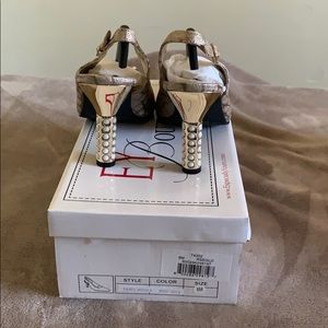 These beautiful rose/gold pumps are very stylish for any formal occasion. The heel has pretty pearls on them that make the shoes really stand out.