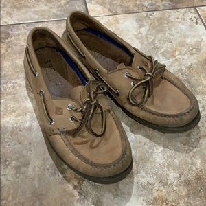 Men’s Sperry shoes 8.5. They have some darker around front but not worn a whole lot, I’m just a honest person!! They was to small for my son so he only wore a few times to a couple school dance’s!! Still in excellent condition and a lot of wear still in them!!
