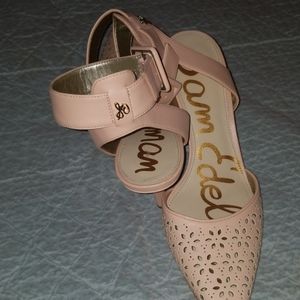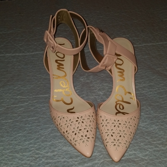 Good morning. What is the height of the heels and is there any scuff marks or discoloration on the shoes?