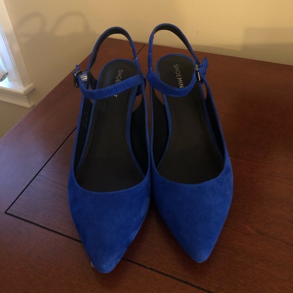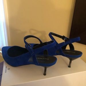 Royal blue suede sling back pump with silver heel. Size 8.5. Gorgeous shoe.