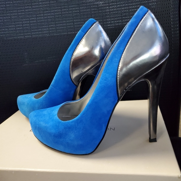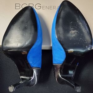 BCBGeneration gently used jazzy electrifying blue and metallic grey 3.5 high heel pump will catch the attention from across the room. Fashionable and stylish heel can be worn casually or dressed up in the office or out to dinner. (Minor scuff on left heel as shown)