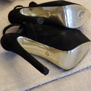 Blk suede, front net,slingback suede heel,peeptoe,gold bottom,very sexy easy 2 walk n.wore once