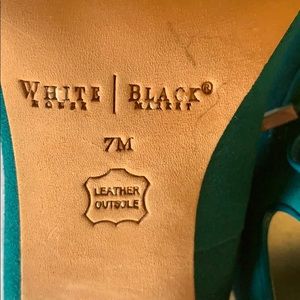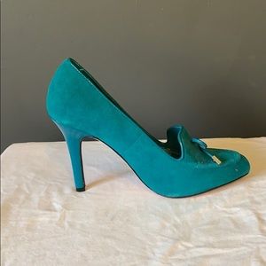 Eye-catching suede heels from WHBM. Leather wrapped bow with silver accents on the toes. Barely worn.