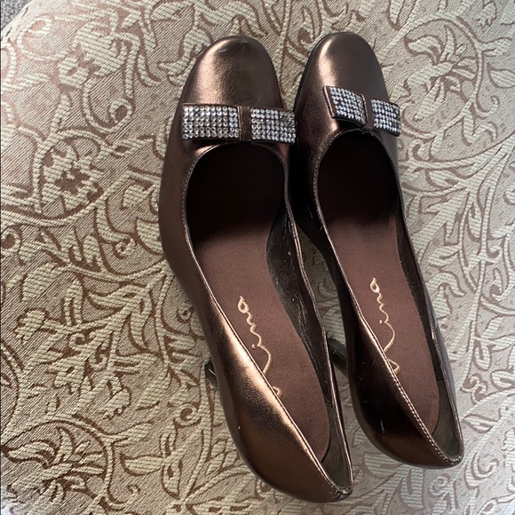Pewter gold/brown heels with crystal bows New/never been worn