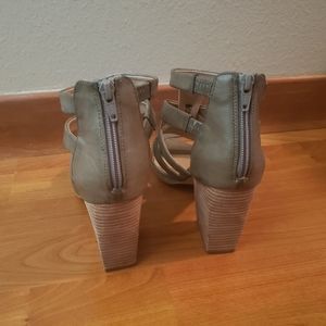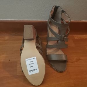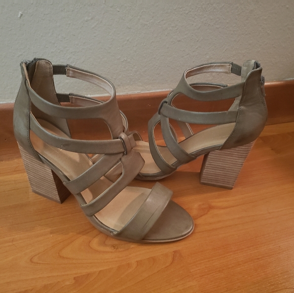 Gray/taupe strappy sandal with chunky heel and zipper in the back.