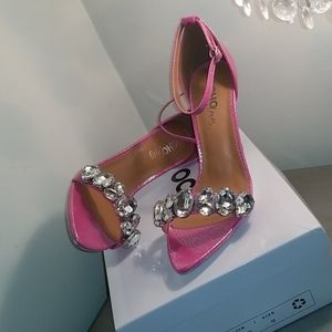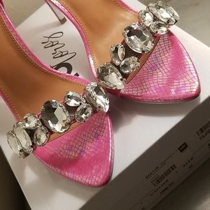 Sexy Iridescent pink snake print peep toe heels with glass rhinestones detailing across the front strap with silver bottoms