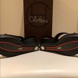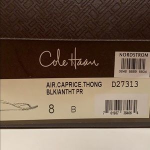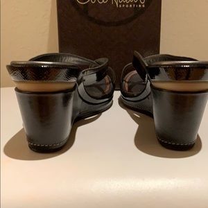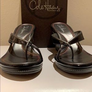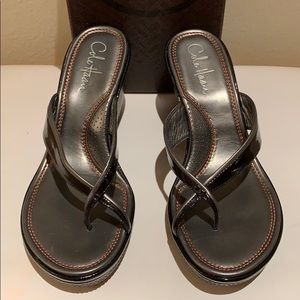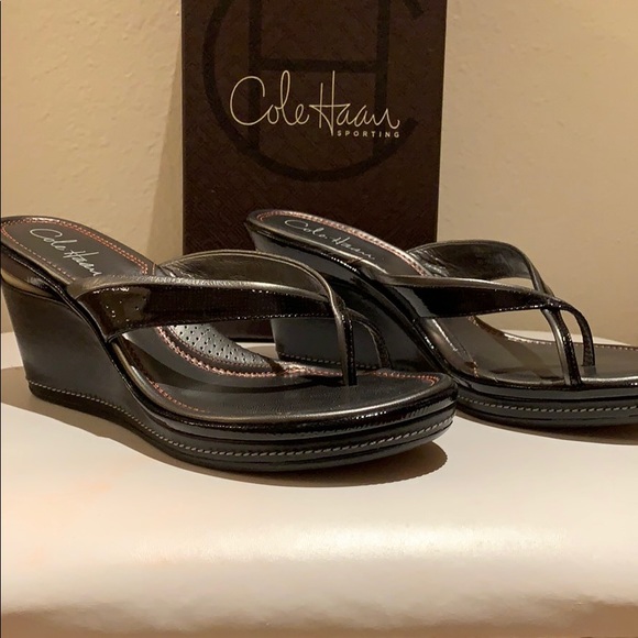 Black leather wedge thong with patent leather straps. Never worn with box.