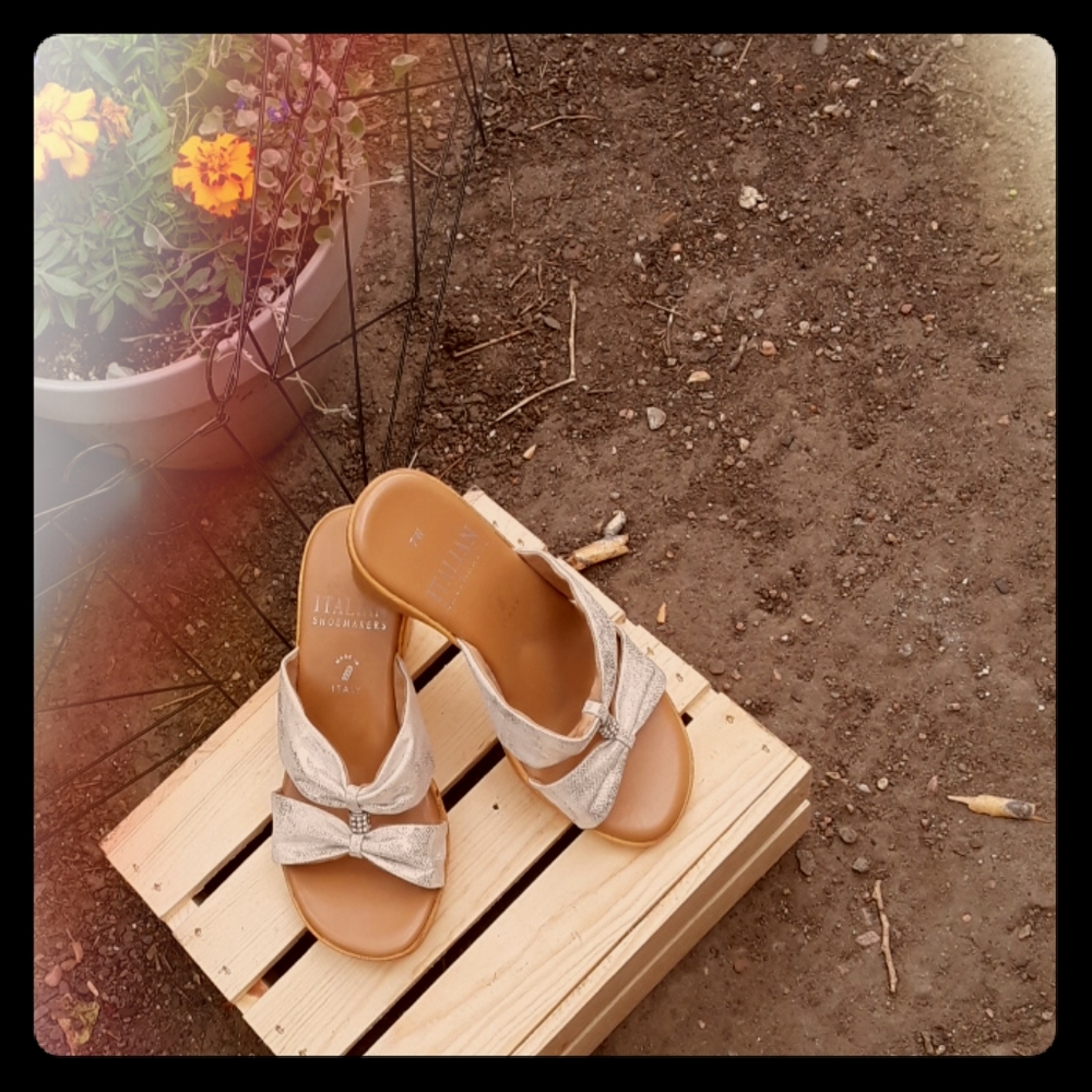Silver, strappy wedge sandal with rhinestone accents for that little touch of "bling " with comfort. 3" wedge heel, open toe. Hard rubber wedge made to look like cork. Small wear spot on right heel, otherwise, great fit for YOU this summer!