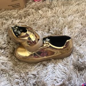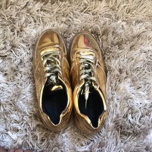 Shiny gold pair of shoes with glitter gold laces in black inside the shoe