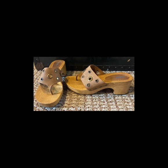 Adorable slip-ons. Wooden platform with leather top w/ metal rivets and holes. Some little wear.
