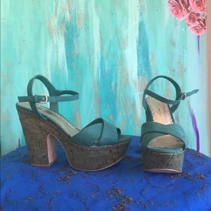 Size 7 and half greenish platform style shoes cork heel and comfortable to walk in great condition