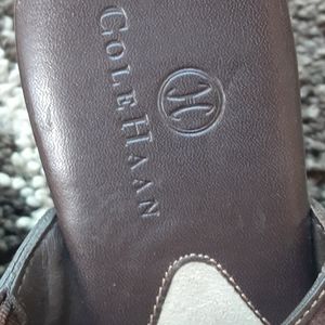 Cole Haan Brown Suede 3 - inch Heeled Slip-on Mule with brass hardware in front and on sides; comfortable, in very good condition