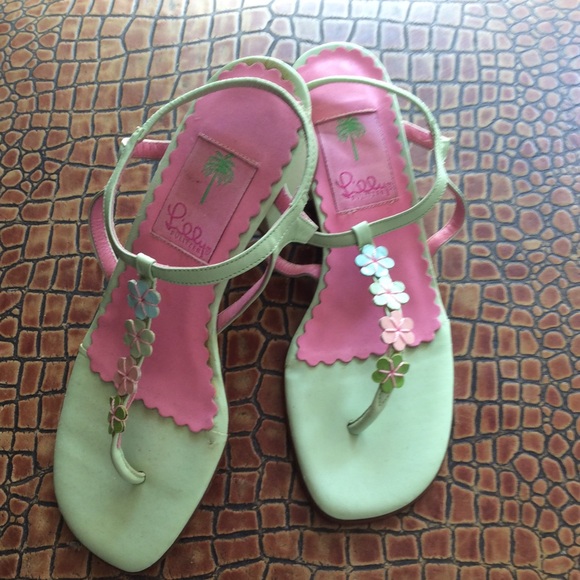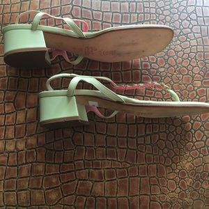 Lily Pulitzer Strappy Sandals. Lovely shade of aqua with hot pink padded footbed. Small gree, pink and blue leather flowers on front strap. Leather sole. Chunky 1 1/2” heel with rubber tip. Made in Italy. Original price $145.