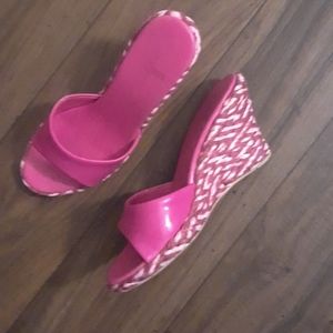 Toe & heel out; slingback w/pink & white rope heel trim