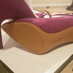 Smooth leather, deep magenta, 4 inch ankle strap pump, beautiful for business and easily transitions to evening fun. Wears well with everything. Never worn.