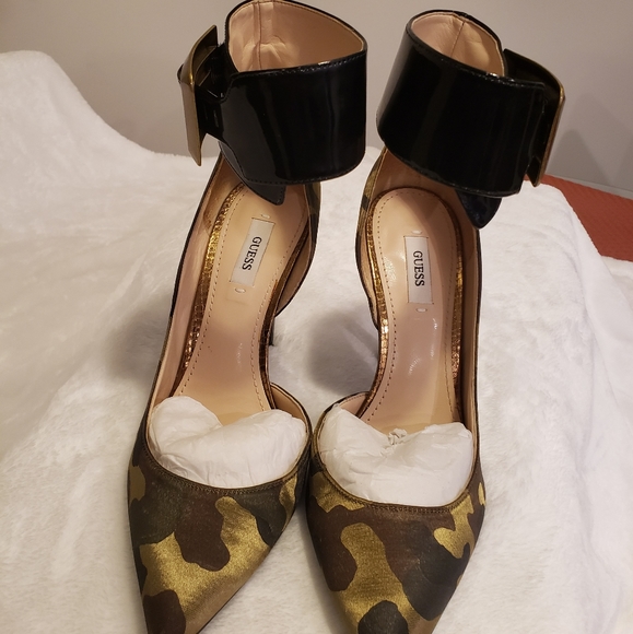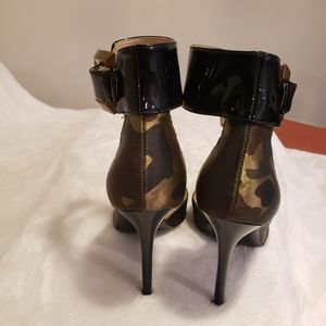 Satin, camouflage ankle-wrap w/buckle fastening. Worn once.
