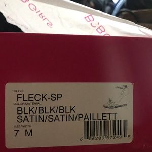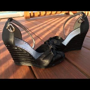 Bebe black formal wedges. Wow. These are a stunner. Body of shoe is a black satin, open toe with a bow. Wedge is full black sequins. Love these shoes. Don’t fit anymore after having child. Super comfortable, excellent used condition
