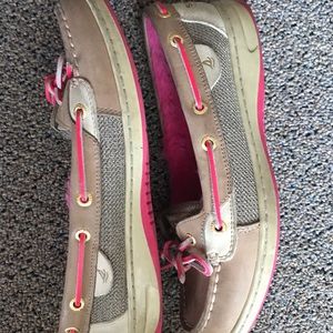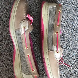 These are the cutest, pink Sperry topsiders. Lined fuzzy, bright pink inner soles and side. Gently worn and in excellent condition.