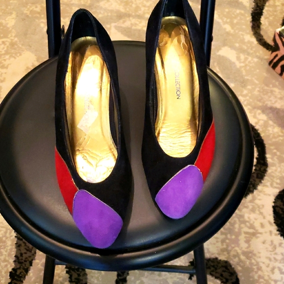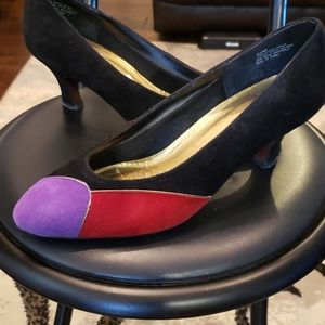 Pair of suede blk/purple and red color in the front, suede, small heels