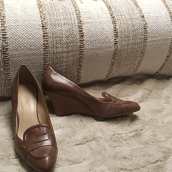 Very comfortable, brown leather, Polished wooden heel, Penny loafer style wedge