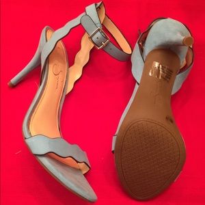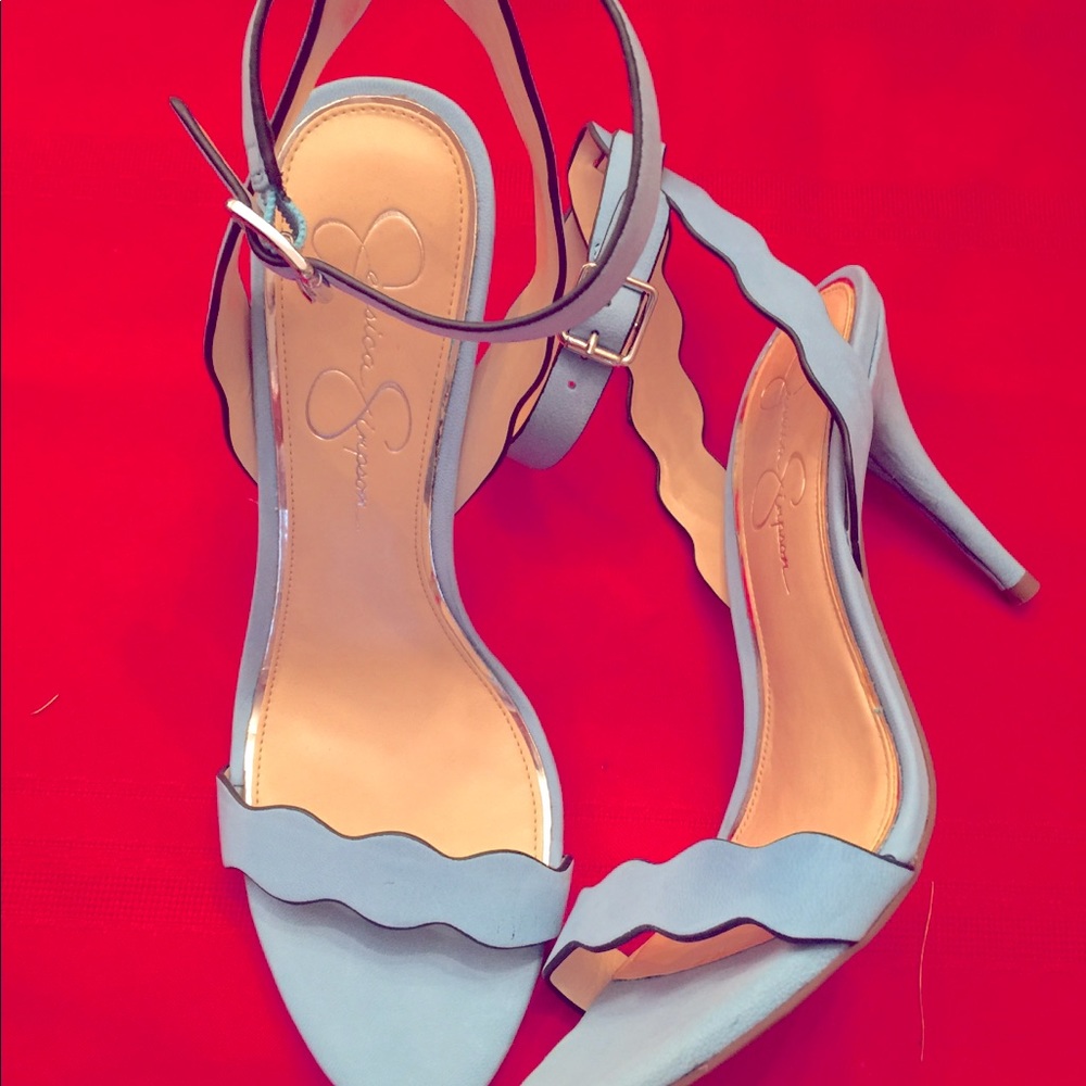 Baby blue, wave Cut ankle strip. 4” heel. Runs a little small. I wear an 8-1/2 these are a 9. Warn 1 time. Very cute.