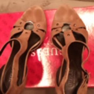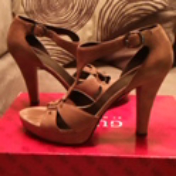 😍Beautiful Guess Suade open toe Heels with medal studs only worn a few times.. Excellent condition. Just a few nicks on the left back heel.. Barely noticeable.. original box