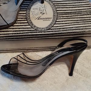 Amano Bootier These shoes are vintage from the 1970's! Slingback stiletto peephole. Black amano leather suede and clear vinyl top. 3.75 in heel