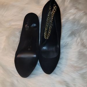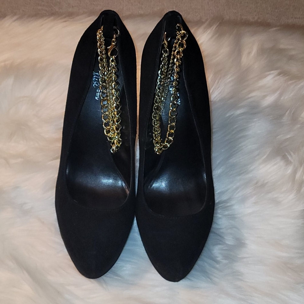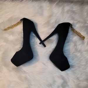 Black stiletto platform pump features a chain ankle strap