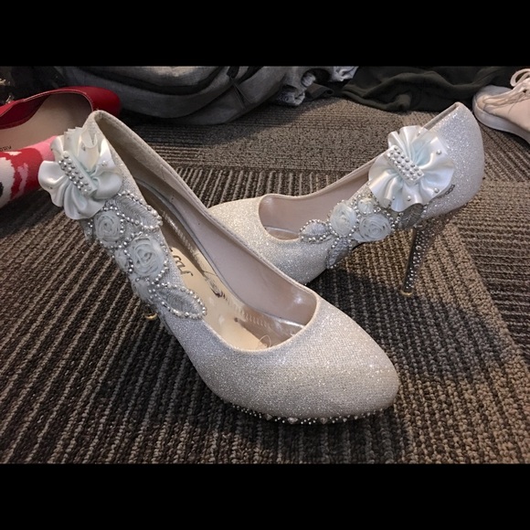 It’s silver high heel shoes with a very light blue bow on both sides, and it has diamonds on the both sides. It has diamonds all over the heels on both shoes. The blue roses have diamonds around them.