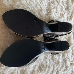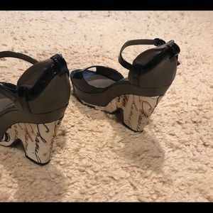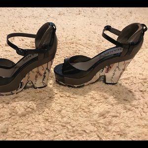 Authentic Chanel platform shoes in black shiny leather. 4,5 inches hills height, 1,5 inches front platform height, 6,5 inches from top to bottom, 3 inches wide. Platform is made of textile with Chanel logo all over.