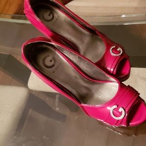 Beautiful open toe patent leather heels with rhinestone signature "G". They are in excellent condition! Make me an offer!