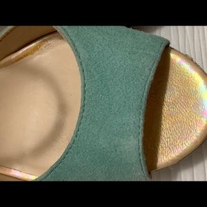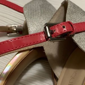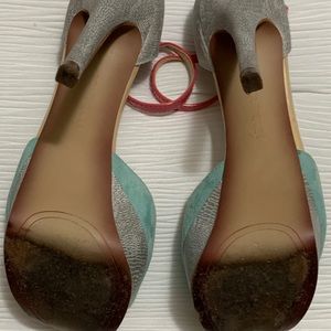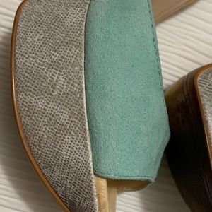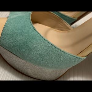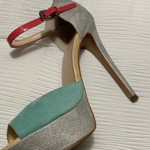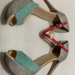 Boutique 9, The suede is color teal, the straps are Coral, the Platform is glitter silver. Excellent conditions.