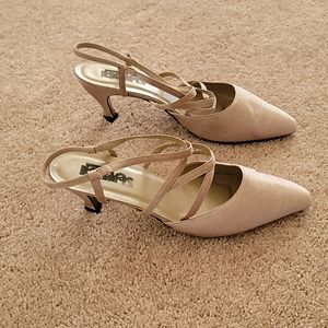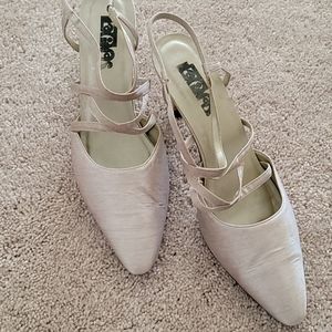 Beige silk strapoed shoes with the heel out. Very comfortable and snazzy look for any occasion. Slightly worn.