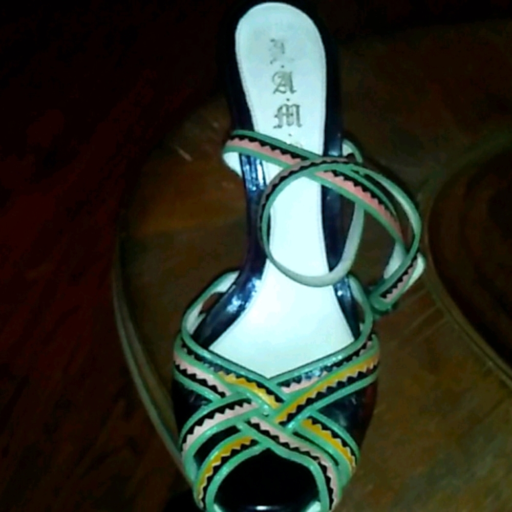 A 4 to 5 inch pump from Gwen Stefani line Brown with Aztec print salmon mustard aqua