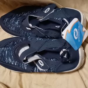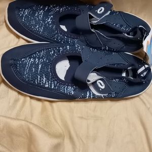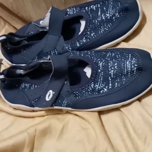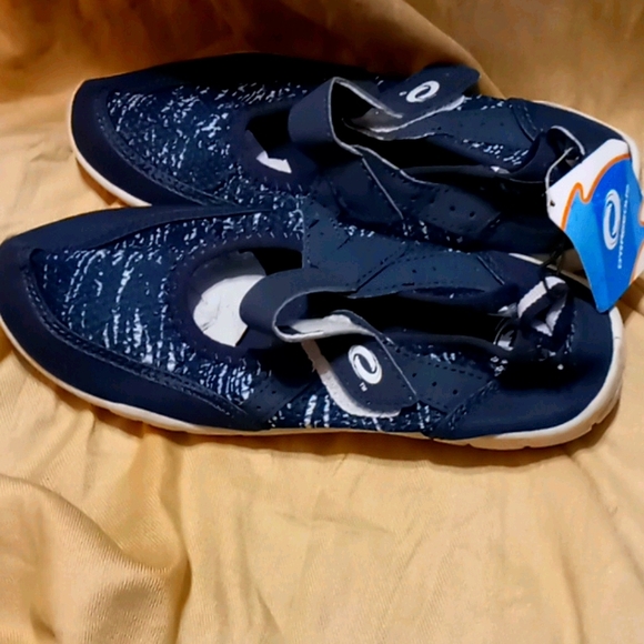 Blue and white swim shoes.