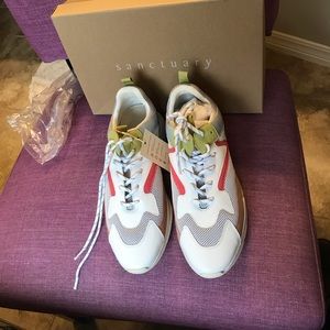 New with tags, never worn, Sanctuary tennis shoes. “SA-GROOVE” White-Gray/Blush.