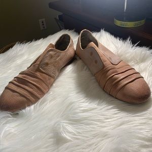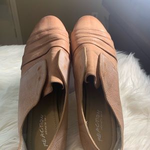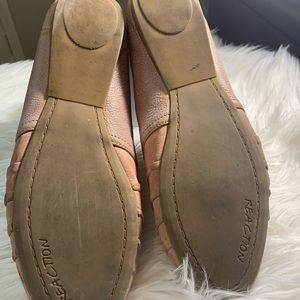 Reaction (Kenneth Cole) beige/tan flat slip-on. This shoe is very comfortable. Size:10. Used with a lot of wear left in them. A small black mark on the left outer side of the left shoe, a small dark spot on the inside of the shoe and the same dark spot on the inside of the right shoe (heel area).
