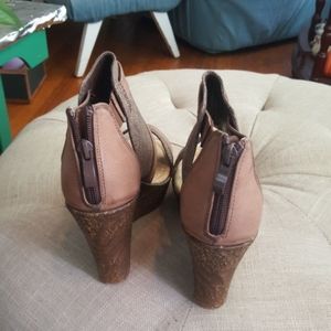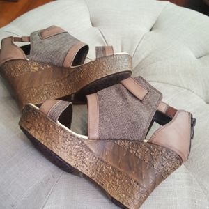 Canvas with plastic leather. Very light shoes. Wedges. With zipper in back. Very stylish. Never worn.