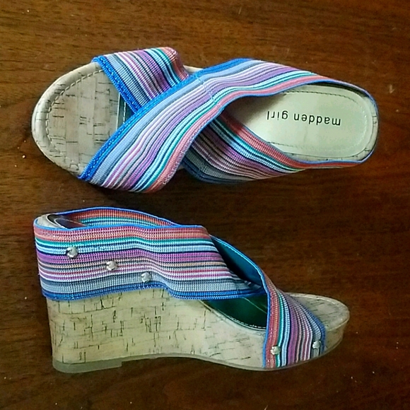 Awesome summer wedge sandals that literally go with EVERYTHING! Cross over stretch woven straps, cork wedge. Colors are red, orange, green, brown, tan, varied blues, pink and tan. Great condition! No damage.