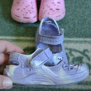 Crock-like shoes. Pink is slip on. Purple is Velcro.