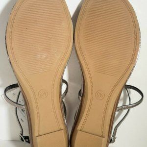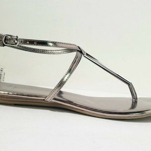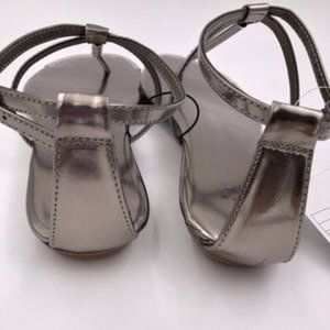 Metallic Sandals - Space Thong in Pewter color w/Instep Adjustable Strap.Padded low heel sandal with a long metal rod coming up the front of your feet. Material is Faux Leather. New in box. Cute and great for running around the house or your spaceship!