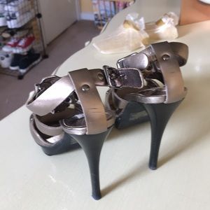 This beautiful Steve Madden bronze/ gold tone shoes. Perfect with jeans, fitted clothes or just about anything. You will be notice in these. Have a bit of platform making it easier to walk in.