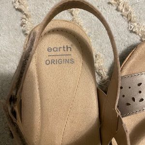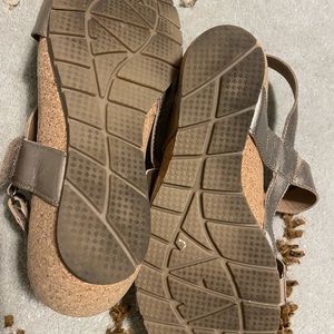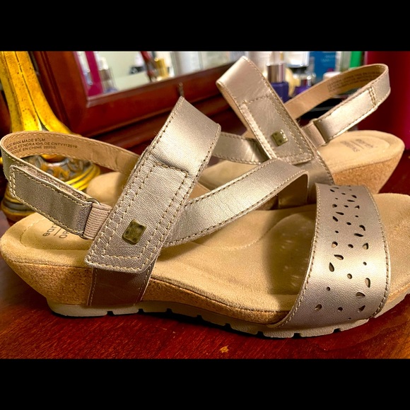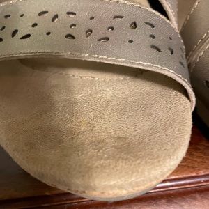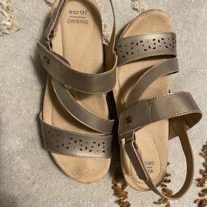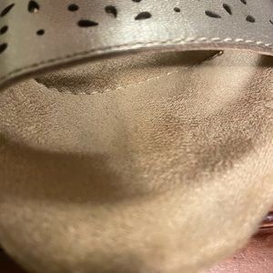 Easy wearing, comfortable, shoe with Velcro closers. Soft silver-gold metallic lustrous appearance. Selling these because I received a pair as a gift. A few toe prints not easily seen.