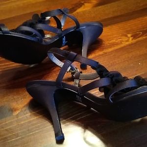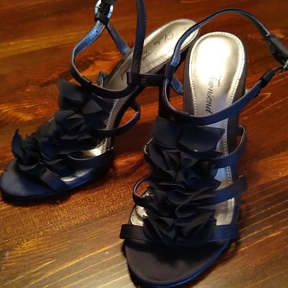 Pretty as can be black high heels with cute black flowers on the top. Great condition. A great assesory to that little black dress!!