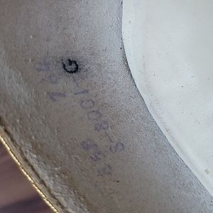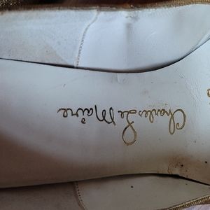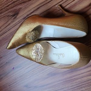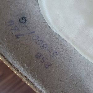Vintage classic gold shoe. There's no place like home! That's the message. Your home. 😄Absolutely beautiful. Heels need repair. I love this shoe. I thought it was a size 8, but clearly they are not. I tried them on, but they were to tight.. I am an 8. I have taken pictures of inside. Maybe you can figure out the true size. I would say they are a size 7. Great pair of shoes. Fair condition. Scruff marks on the back of heel.