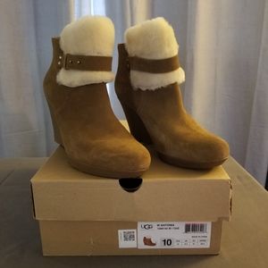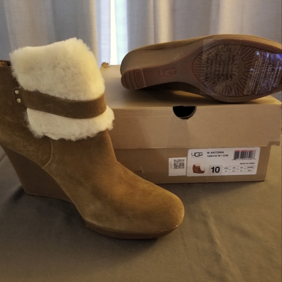 These are UGG Antonia chestnut suede ankle boots. The are new in the box. Still has sticker on the bottom. Never been worn. Looks nice paired with jeans or a skirt. NWOT