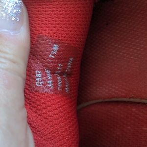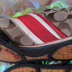these are a great pair of Coach Jayme sneaks, brown and tan, with red accents, can see they have been loved, (price reflects), bit tons of life left in them!!!! they look so good with the Coach signature Handbags!!!