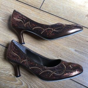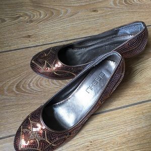Designed with sequins and embroidery. In a marvelous copper color. Makes the perfect slip on for any occasion. See photos for more details. Smoke and pet free house. Willing to bundle items for your purchase convenience and shipping discount.